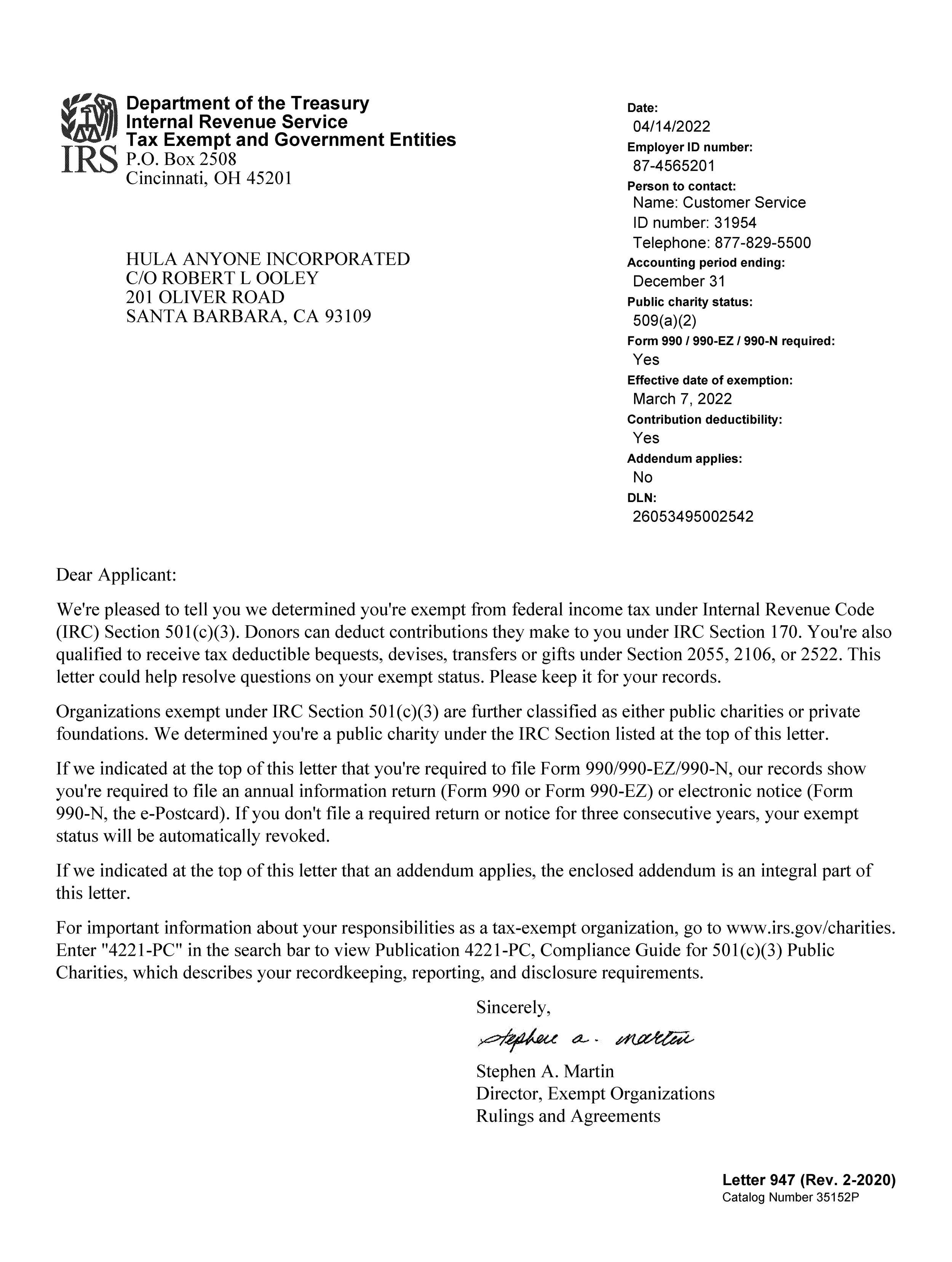 For our donors' records and peace of mind, we maintain full transparency regarding our federal standing. You may view or download our official IRS documentation below: